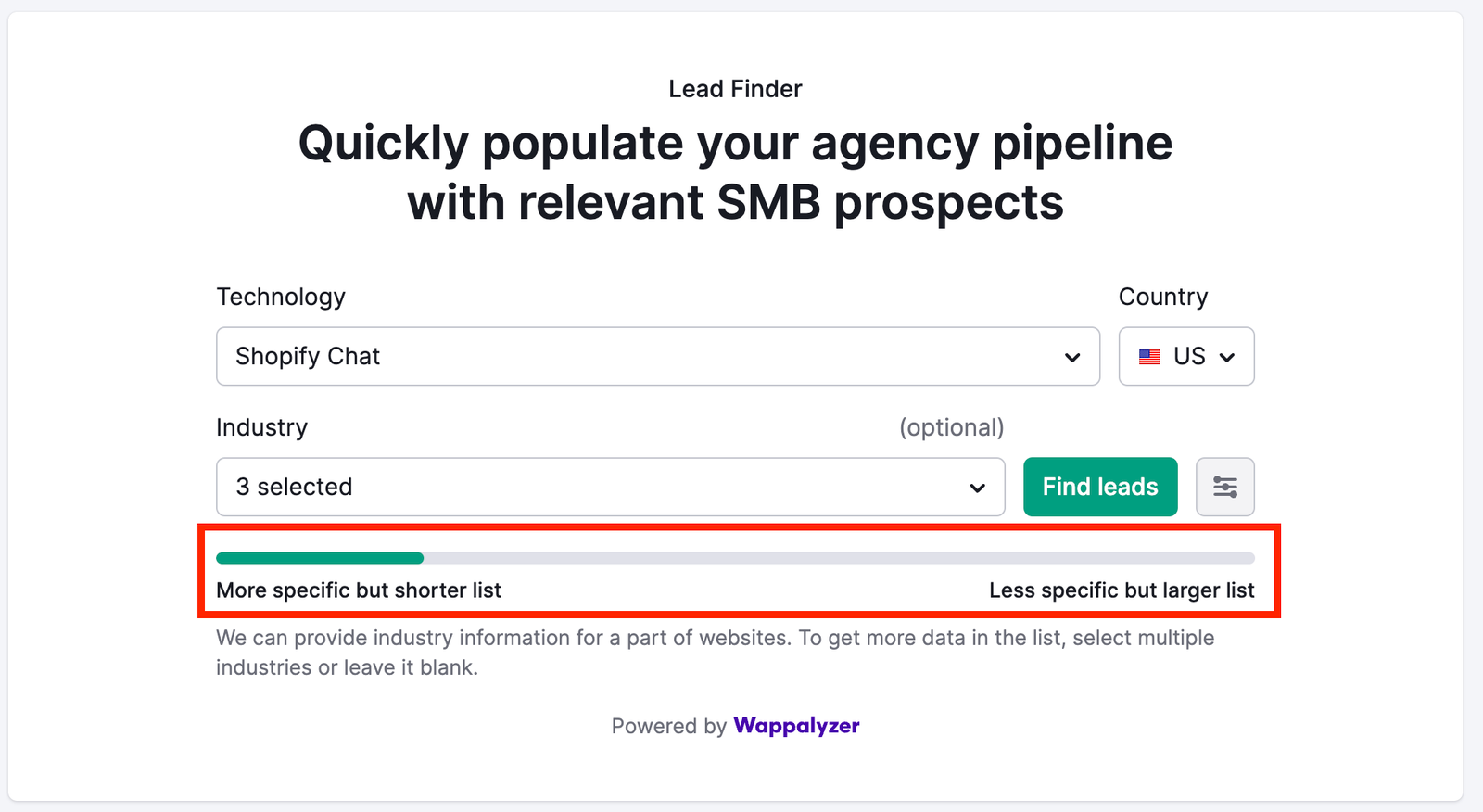 The data in Lead Finder comes from our partner Wappalyzer that generates lead lists based on technology, industry, and location. Data on various aspects of a business’s online presence comes from Semrush.